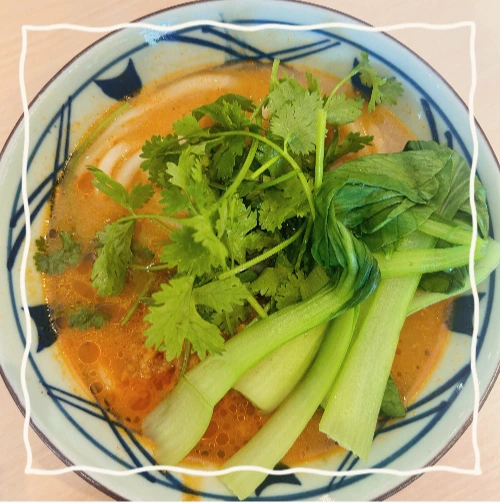 뜨끈한 우동에 고수를 듬뿍 올린 맛.