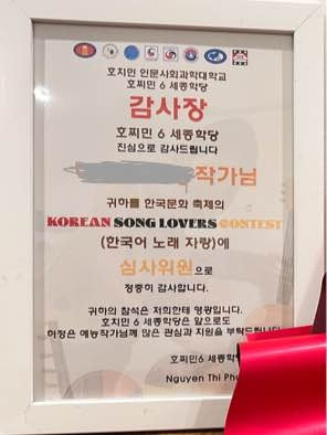 갑자기 뚱딴지같은 이건 무슨 말일까. 아이의 시선을 따라가 보니 예전에 한글날을 기념해서 호치민에서 한국어를 공부하는 학생들의 한국 노래 대회 심사위원으로 갔을 때 받은 감사장을 보고 있었다. 크게 한글로 '감사장'이라고 쓰여있으니 내 이름인 줄 알았나 보다. 다른 아이에게 보여주니 "아~ 선생님 이름이 김사장이었어요?" 그마저도 틀리게 읽었다. 이 또한 모르면 그럴 수 있겠구나 싶다. 가깝고도 먼 나라, 아무리 한국인들이 많이 모여 사는 베트남이라고 해도 해외이긴 하니 벌어지는 일들이다.