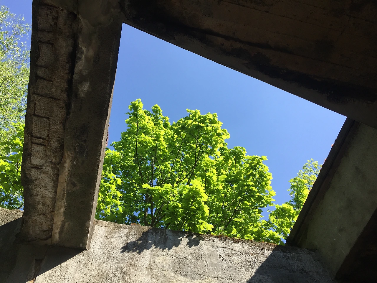공원 안으로 들어오니, 더 이상 사용하지 않는 폐허가 된 콘크리트 구조물이 보였다. 기둥, 대들보, 뼈대만 남아있었다. 뚫려 있는 천장과 벽 사이로 파란 하늘과 무성한 나무들이 보였다. 자전거를 타고 들어온 아이들의 모습도 보였다.