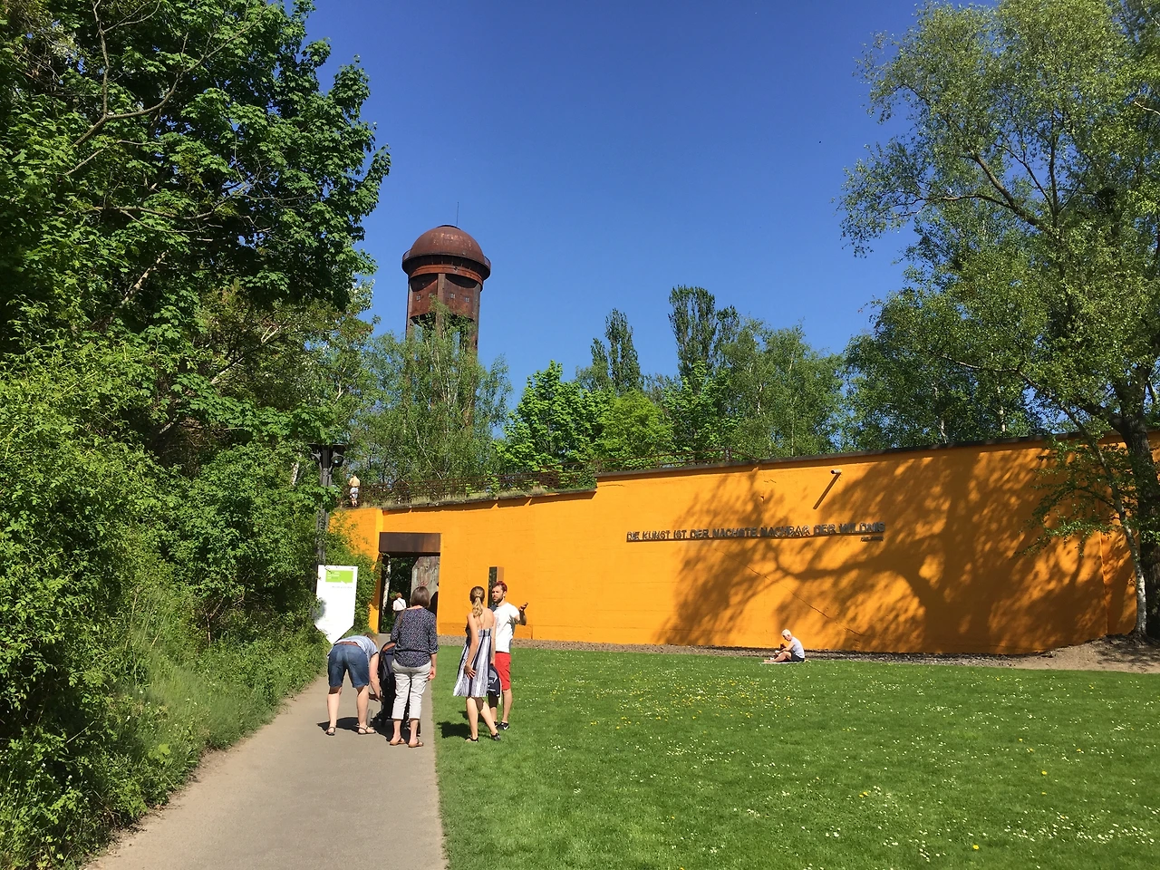들어가자마자 쨍하게 노란 건물벽과 멀리 높이 솟은 녹슨 철골 구조물이 눈에 들어왔다. 짙은 녹색의 나무들과 파란 하늘 덕분일까. 녹슨 산업유산과 무성한 자연환경은 어쩜 이렇게 잘 어울릴까. 마치 하나의 예술작품처럼 보였다. 파란 하늘과 함께 더욱 예뻤던 입구.