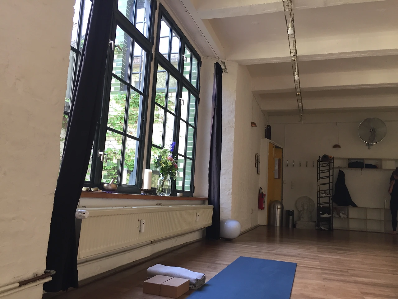 옐로 요가는 크로이츠베르크 중심가 근처에 위치해 있었다. 나름 번화한 동네였다. 가로변으로는 카페나 레스토랑, 서점 등이 있었고, 요가 스튜디오는 현관을 지나 중정으로 들어가야 했다. 일단 안 쪽에 위치해 있어, 거리변 소음이 차단되어 조용하고 안정된 분위기 조성이 가능하다. 그리고 중정의 나무들과 맞은편 테라스, 하늘까지 아름다운 풍경이 만들어진다. 열린 공간에서 날씨를 느끼며 명상을 할 수 있다.