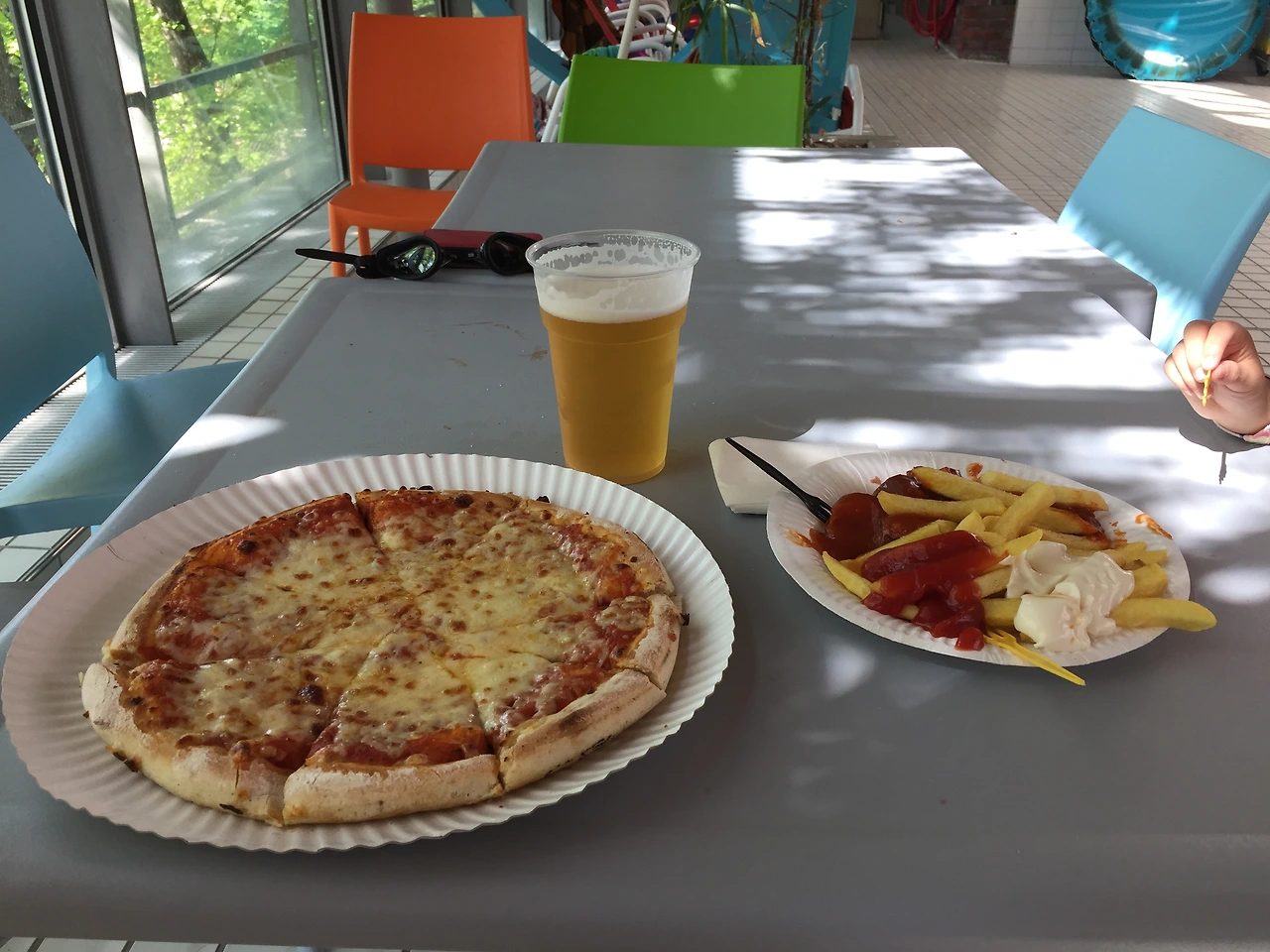 제대로 된 수영을 하는 것이 아닌, 그저 물에서 조카와 첨벙첨벙 소소하게 노는 것밖에 하지 않았는데. 그 일도 3시간을 하니 굉장히 허기가 졌다. 2층에 위치한 매점에서 요기를 하기로 했다. 역시 맥주의 나라답게 실내수영장 안에서도 맥주를 마실 수 있었다. 조카가 좋아하는 감자튀김과 배를 채워줄 피자를 주문했다. 인스턴트를 데워주고 튀겨주는 정도의 음식이었지만, 너무 허기져 있던 터라 허겁지겁 먹었다. 맥주를 마시고 빨개진 얼굴을 식히느라 썬배드에 누워 쉬었는데, 어찌나 좋던지.