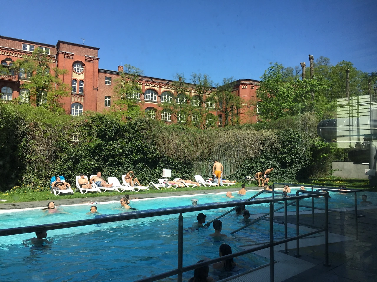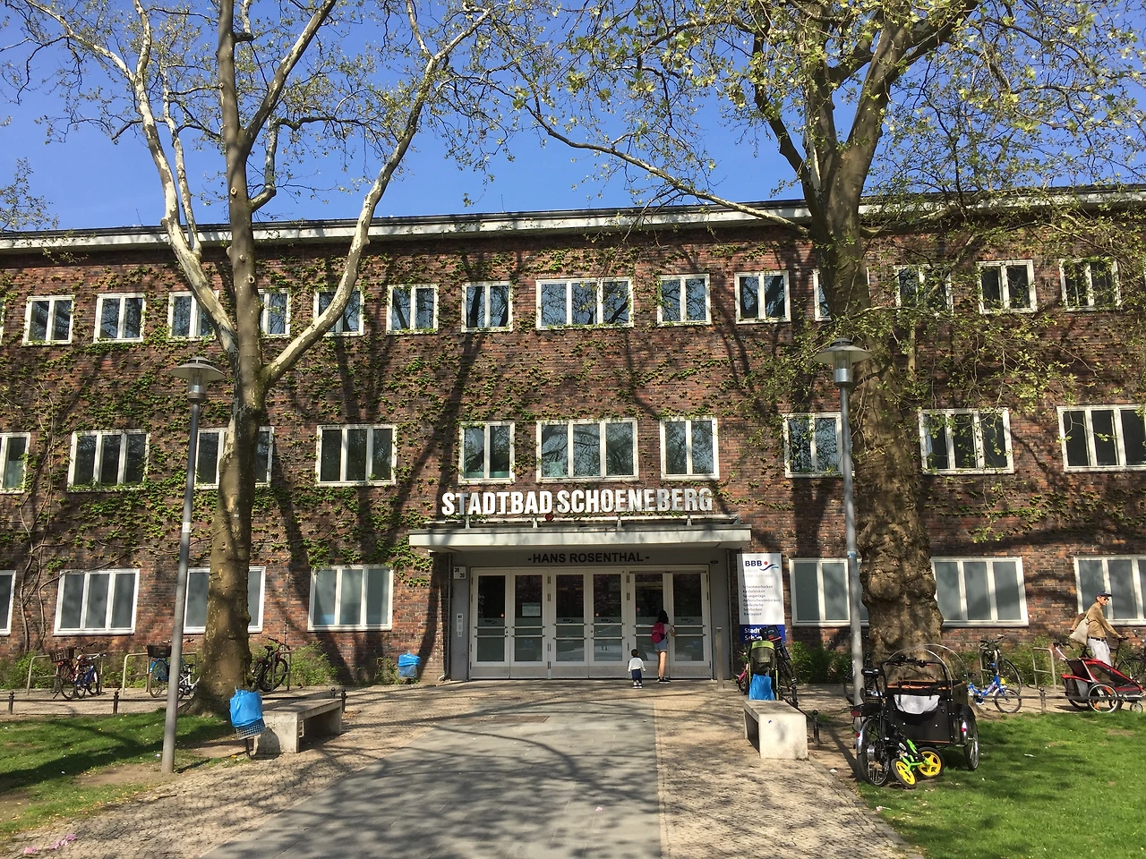그리고 날 좋은 5월, 갓 태어난 둘째 조카와 언니의 배웅을 받으며 형부, 조카와 함께 근처 시립수영장으로 향했다. 옆 동네인 쇠네베르크에 위치하여 수영장 이름도 '쇠네베르크 시립수영장 Stadtbad Schöneberg'이다.