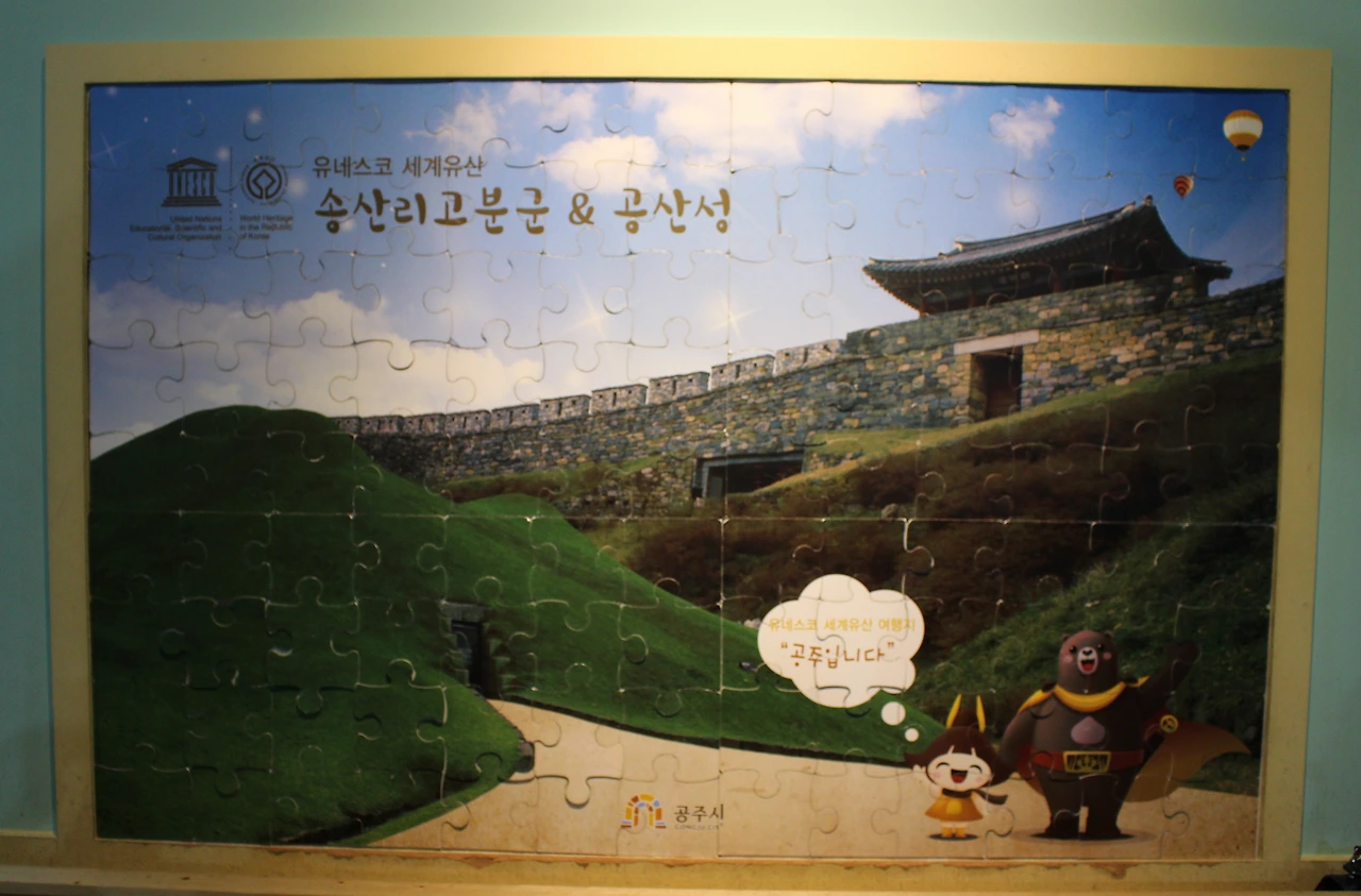 무령왕릉도 한옥마을과 별반 다를 게 없다. 잔뜩 기대했던 무령왕릉은 영구 비공개 조치로 들어갈 수 조차 없었고 그대신 우리를 반기고 있는 것은 두개의 전시관뿐이었다. 전시관에 들어서자마자 웅진(공중의 옛 이름)이라는 이름의 유래를 보여주는 설화 그려진 커다란 만화책 설치물이 보였다. 누가 먼저 시작했는지 알 수 없었지만 동기 동생들은 만화책 구연동화를 하기 시작했다. 한명은 곰, 한명은 사내, 한명은 나레이션, 나를 포함한 나머지 한명은 리액션을 맡았다. 즉석에서 시작된 구연동화 덕분에 우두커니 서있던 만화책 설치물은 살아있는 이야기가 되었다.