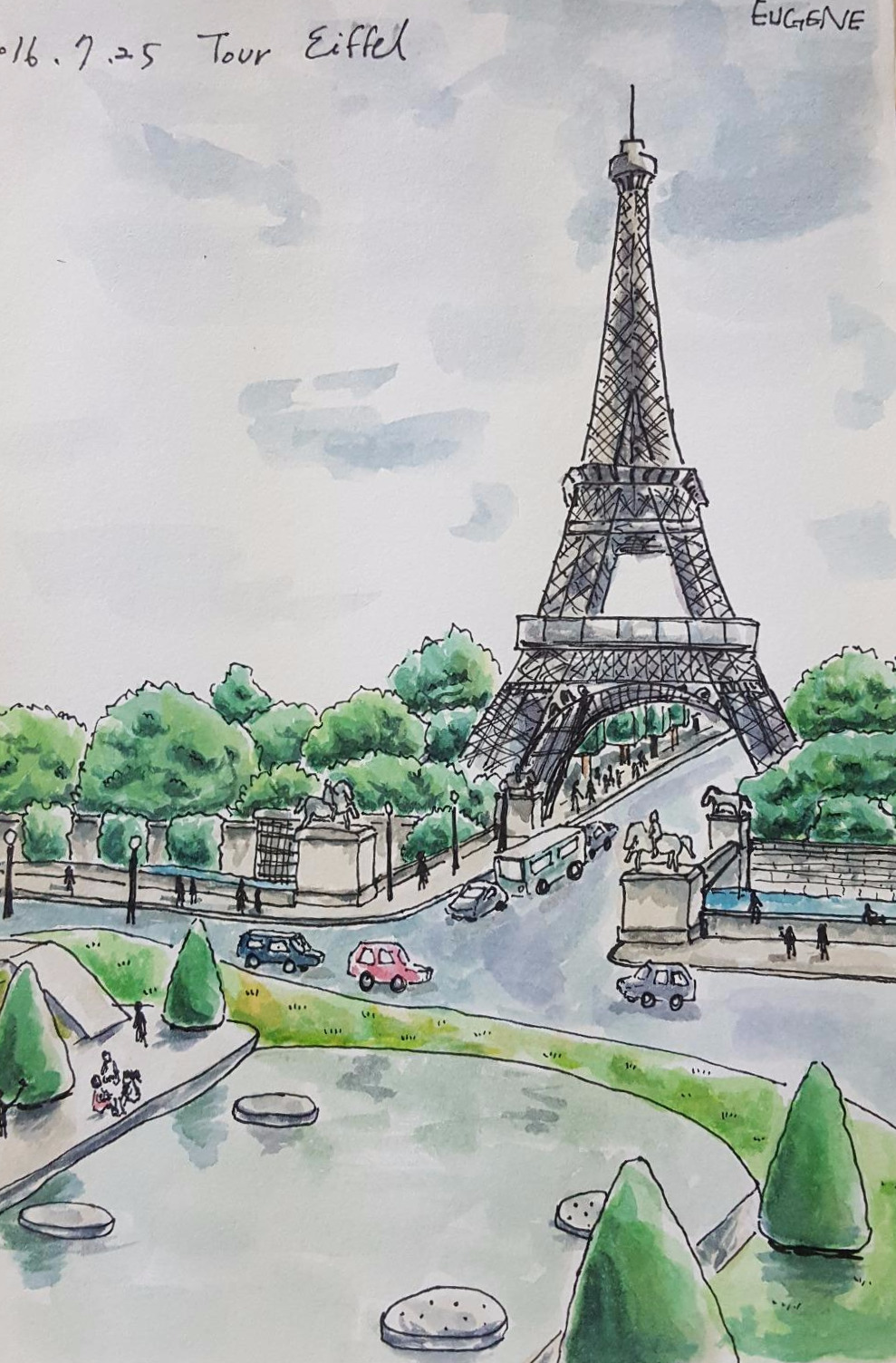 다음은 에펠탑. 파리에 있으면서 자주 보고 거의 매일 갔던 그곳이지만 잔디밭에 앉아서 찬찬히 들여다본 기억이 없어서 다시 찾았다.(잔디밭에 앉아 에펠탑을 만끽하는게 나의 로망이기도 하였다.) 그리고 무엇보다 나의 드로잉 노트에 아직 에펠탑이 없었다. 나는 blanc 맥주 한 캔을 들고 잔디밭에 자리를 잡고 에펠탑을 그리기 시작했다.