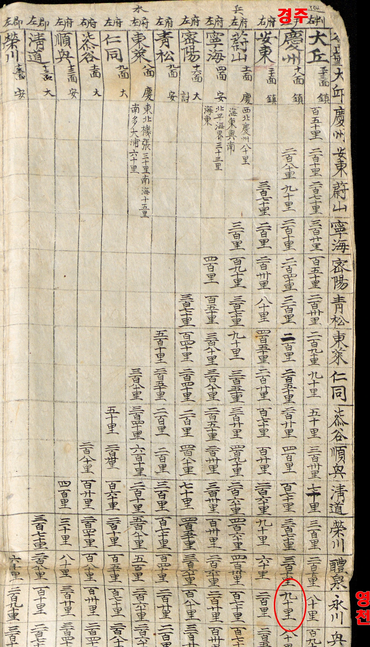 그럼 조선후기의 거리측정은 얼마나 정확했을까? 위의 지도는 ‘청구지남’의 일부로 세로와 가로의 첫 열에는 대구(大丘), 경주(慶州), 안동(安東)등의 지명이 쓰여 있고 그 외 다른 칸에는 다양한 숫자들이 쓰여져 있다. 해당 숫자들은 지역간의 거리를 의미한다. 예컨대 경주와 영천의 거리는 구십리(九十里)로 되어있는데, 10리가 4km인 것을 고려하면 두 지역간의 거리는 36km라는 뜻이다. 그리고 오늘날 인터넷에 ‘경주 -영천 거리’를 검색하면 아래 사진에도 나와 있듯 33.7km로 되어있다. 즉 현재와 거의 오차 없는 정확성을 자랑하고 있는 것이다.