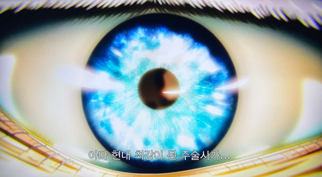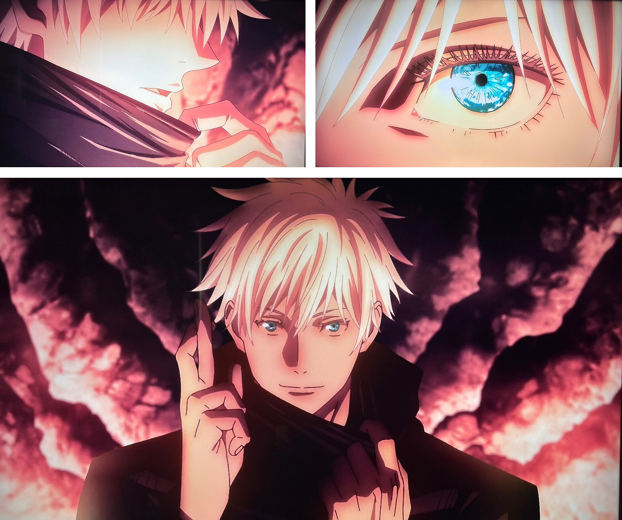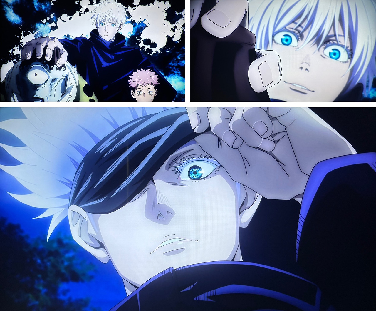 하늘을 비추는 듯한 신비로운 푸른 눈동자와 은빛의 길고 풍성한 속눈썹의 꽃미남이라는 설정이 안대를 벗으니 완성되었다. 아니, 안대를 내리는 순간 얼굴 옆선부터 잘생겨지는 건 왜냐고. 저 눈을 늘 드러낼 수 없는 사연으로 평소에 안대 또는 선글라스를 쓰고 다니는 설정이라지만, 이 얼굴을 7화나 지나고 나서 보여주는 게 정말, 미치게 한다. 어떨 땐 본인이 조금 피곤한 거 감안하고 (충분히 강하시잖아요, 고죠 센세) 저 안대 벗고 나와주시면 안 되나 싶은데, 이게 또 안대를 벗는 순간의 멋짐이 있어서. 계속 보고 싶어, 싶다가 아니, 결정적인 순간에 안대 벗는 센세 섹시해, 가 미친 듯이 싸우게 된다.