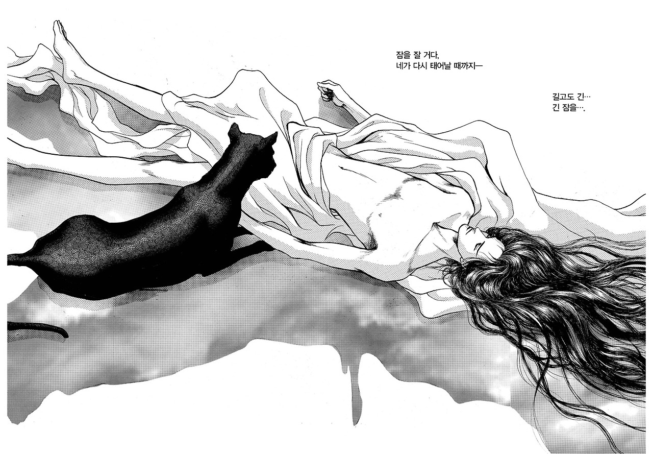 나라를 멸망(?)시키고 불새가 되어 어디론가 날아간 (사라진) 레 샤르휘나를 기다리기 위해 잠이 든 에일레스의 모습. 두 페이지에 걸쳐 눈을 감고 길게 누워있는 에일레스의 모습과 그 옆을 지키고 있는 흑표범, 그리고 그의 독백. 이 페이지를 보면서 한숨을 크게 내쉬었다. 다시 오기는 하려나, 그래서 깨어날 수 있으려나.