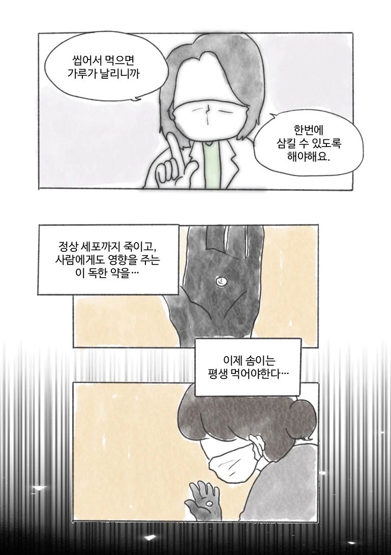 그런데 그렇게 조심해서 먹어야 하는 그 약을 솜이는 매일 먹어야 하게 되었다….