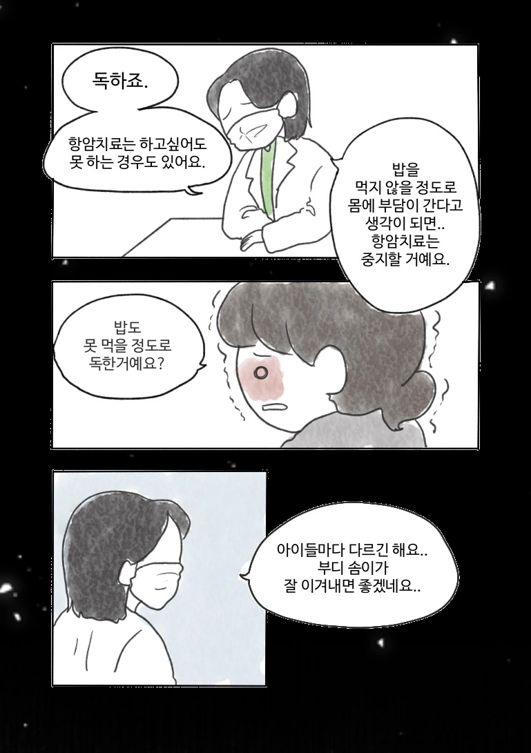 누군가는 항암치료를 굳이 하지 않고 애가 고통받지 않게 하고싶다고 하기도 한다.