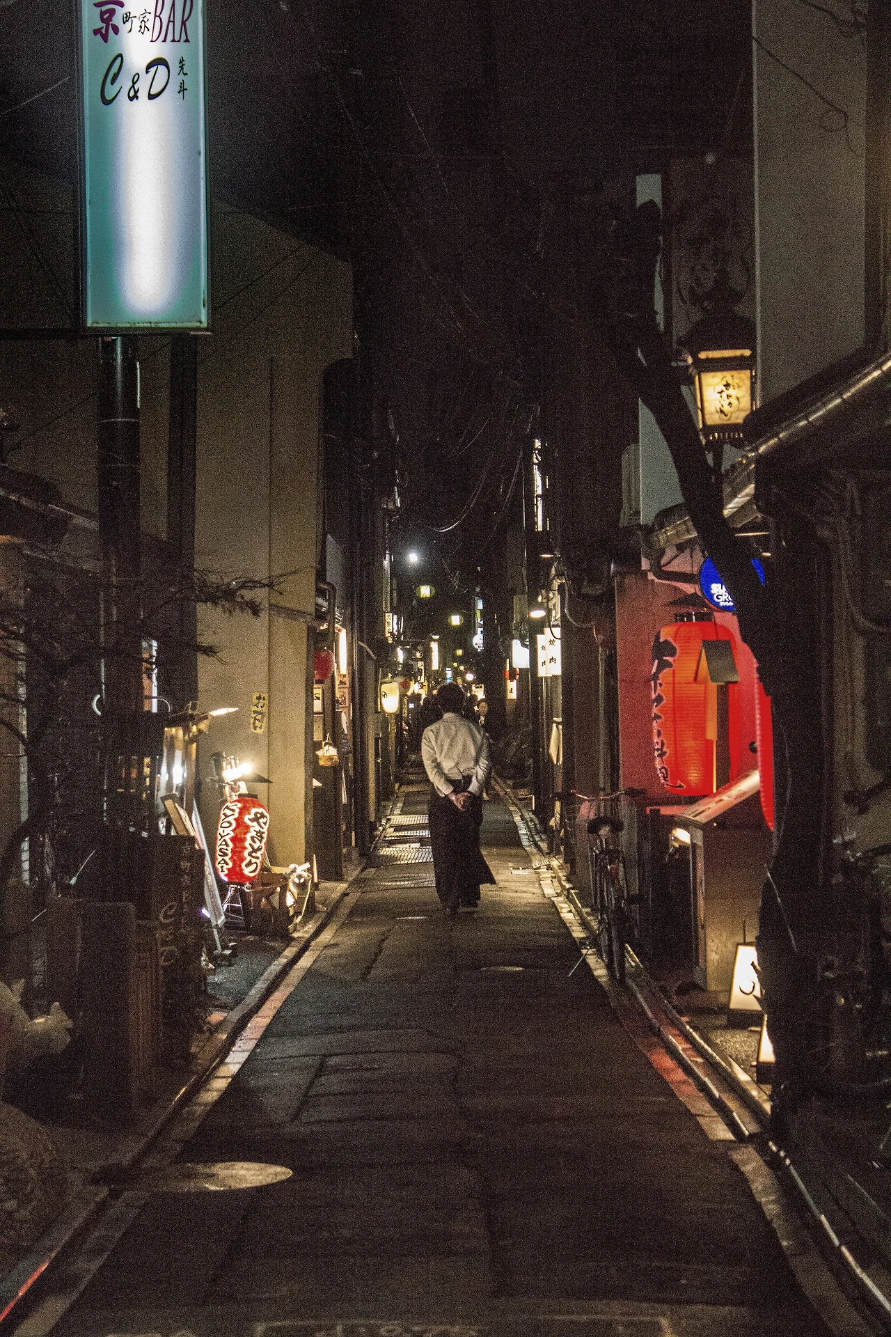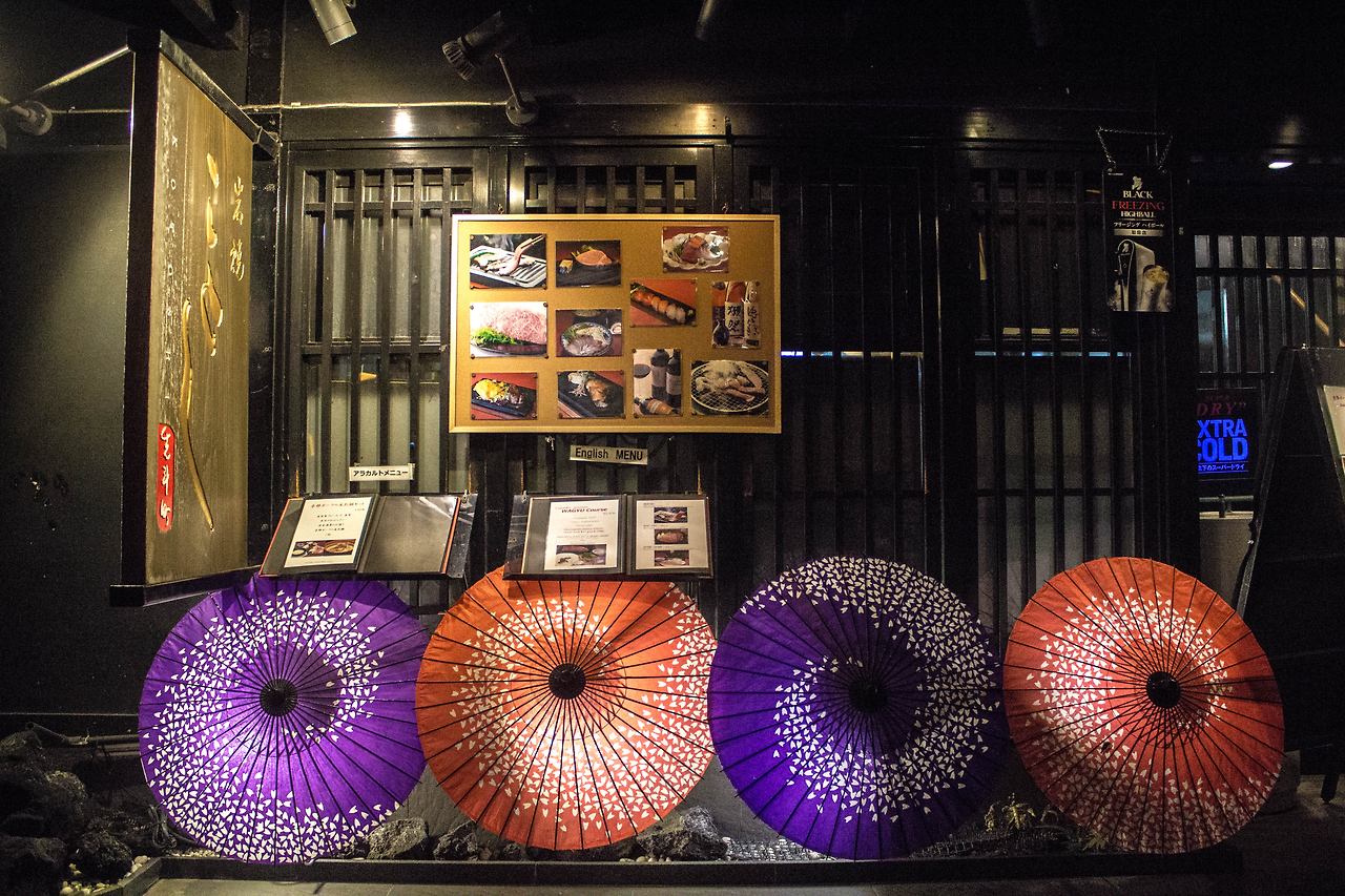 어느새 잠이 들었었는지, 눈을 뜨니 양 어깨와 골반이 욱신거렸다. 카메라와 배낭을 메고 열심히도 걸어다닌 탓이다. 해질녘에 숙소로 돌아왔는데, 어느새 창밖에는 거리의 조명이 어둠을 밝히고 있다. 저녁식사만큼은 홀가분한 마음으로 하고싶단 생각에, 휴대폰과 지갑만 챙겨들고 가와라마치 대로변의 좁은 골목길로 들어왔다.