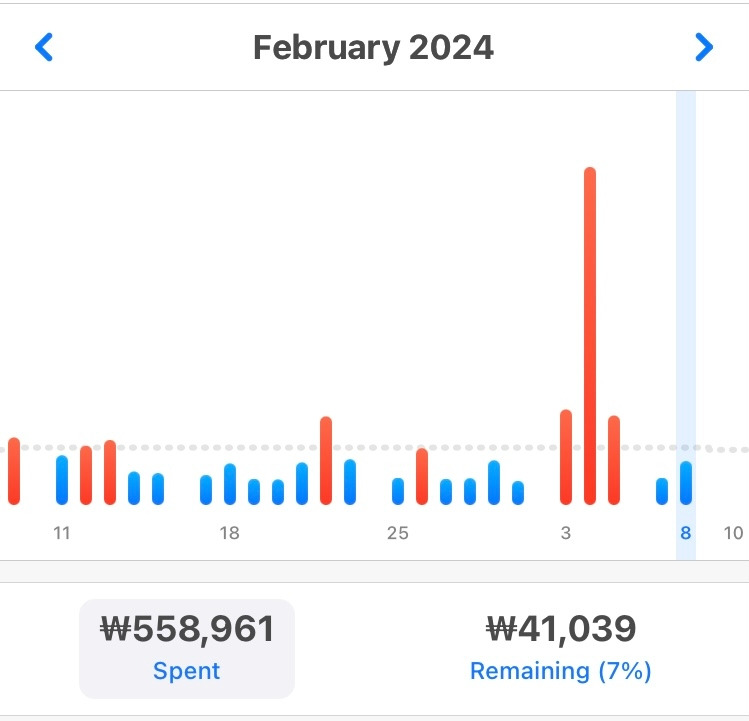 2월 생활비 지출은 558,961원. 41,039원 남겼다. 전 달 대비 식비는 대폭 줄었으나 대신 다른 쪽 지출이 발생하여 가까스로 예산 안에 들었다. 매달 남은 여유 자금을 모아 플렉스 하려던 계획은 생각보다 호락호락하지 않겠구나.