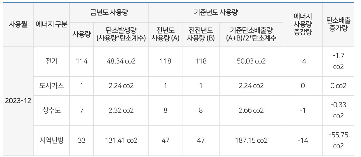 올해 사용량은 아직 업데이트되지 않아 작년 12월이 최신이다. 겨울에는 내가 한 달에 180 정도 이산화탄소를 배출하는구나.