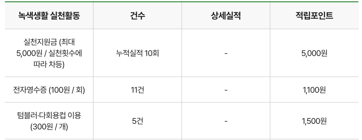 1월 실적은 전자영수증 11건, 텀블러 5건으로 총 2,600원이다. ( + 첫 달 실천지원금 5,000원)