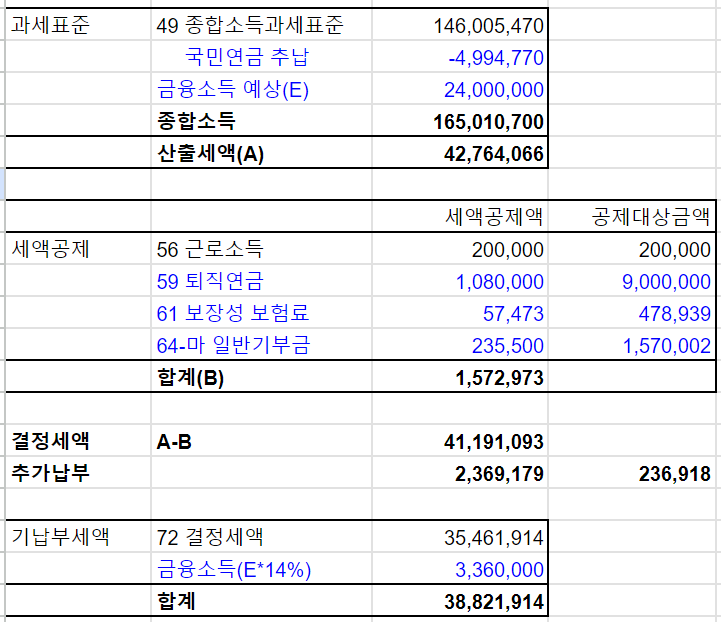 이렇게 보니, 국민연금 추납을 좀 더 할 걸 그랬다 싶다. 2백만 원을 더 납입했으면 종소세가 160만 원 대로 줄어드는데. 중도퇴사 및 은퇴자의 경우, 퇴사한 연도의 소득세율이 높을수록 국민연금 추납의 절세 효과가 크다. 내 경우 납입금액 * 38%이니. (국민연금 공단 직원들은 추납을 얌체 같다고 아주 싫어한다고 한다. 꾸준히 납입한 사람들 보다 얻어가는 게 더 크다고. 계산해 보면 확실히 추납이 이득이 크다. 물론 국민연금이 망하지 않을 거라는 믿음이 있는 경우에 한하겠지만.)