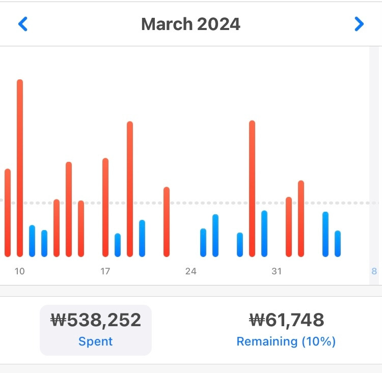 이번 달은 54만 원 정도 사용했다. 옷과 교통비에 추가 비용이 나간 것을 생각하면 꽤 성공적인 달이다.