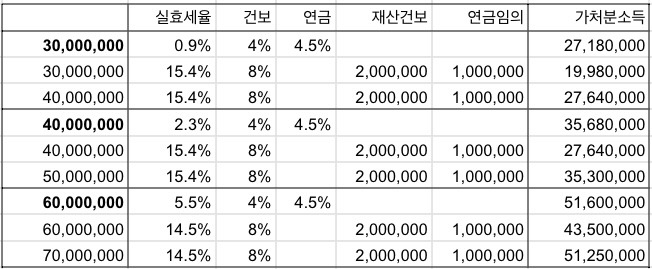 아무튼 비교해 보면, 연봉 3천만 원만큼만 금융소득이 발생하면 FIRE 해야지,라고 생각했다면, 실제로는 천만 원 정도 더 벌어야 비슷한 가용소득을 쥐게 된다는 걸 알 수 있다.