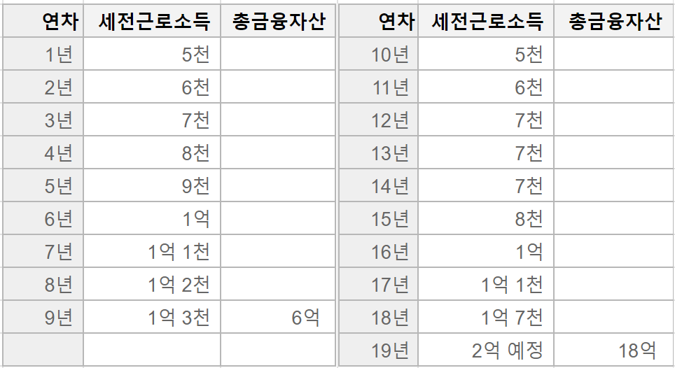 물론 금융자산도 증식을 한다. 현재 금융자산은 예금 8.5억, 중금채 6.5억, 주식 3억으로 총 18억이다. 1년에 주식 배당으로 세후 약 4백만 원을 받으며, 15억의 이자수익은 세후 3%로 가정하면 4천5백만 원을 기대할 수 있다.