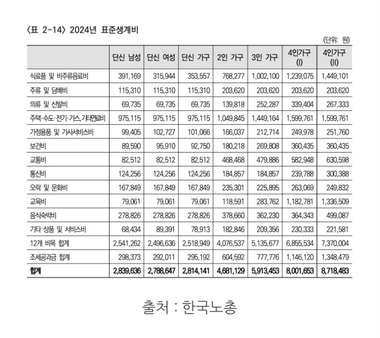 한국노총에서 발표한 표준생계비가 있는데, 아무래도 임금협상을 위해 부풀린 면이 좀 있는 것 같다. 기본적으로 누려야 할 생활수준을 어느 정도로 보느냐에 따라 의견이 다르겠지만. 내 기준으로 보면 단신 가구 월 280만 원은 엄청나게 풍요로운 삶이다. 올해 내 지출 예산이 월 160만 원 정도인데 실제로는 그보다 적게 사용하고 있으니. 물론 여행도 안 가고 사람도 안 만나고 취미는 무료로 할 수 있는 것만 찾아다니고 있어서 그렇긴 하다. 표에서 주거비가 97만 원으로 되어 있는 걸 보면 아마 월세나 대출 이자 포함인 것 같은데, 그럼 17만 원쯤 관리비로 잡고 80만 원을 제하고 보자. 월 200만 원, 지금의 나보다 한 달에 40만 원 더 쓰는 삶이 표준 생활인가 보다.
