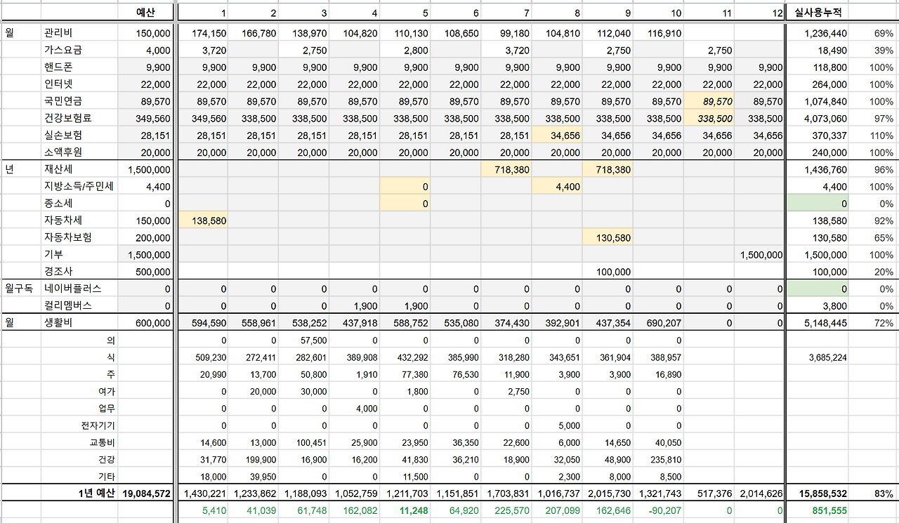 처음으로 60만 원을 초과했다. 병원비 때문인데, 아직 실손 신청을 다 하지 않았으니 일부는 돌려받을 수 있을지도. 몸이 아프니 잘 먹어야겠다는 핑계로 외식을 좀 많이 하기도 해서 식비도 늘었다. 사실 여기에 비밀이 있는데 포인트와 서울페이 적립금 등을 사용해서 가계부에 기입하지 않고 한 5만 원 정도 군것질을 했다. 아프다는 핑계로 풀어준 건데, 정작 이 돈으로 사 먹은 게 몸에 안 좋은 군것질이라는 게 함정. 하지만 마음의 위안도 중요하니까.