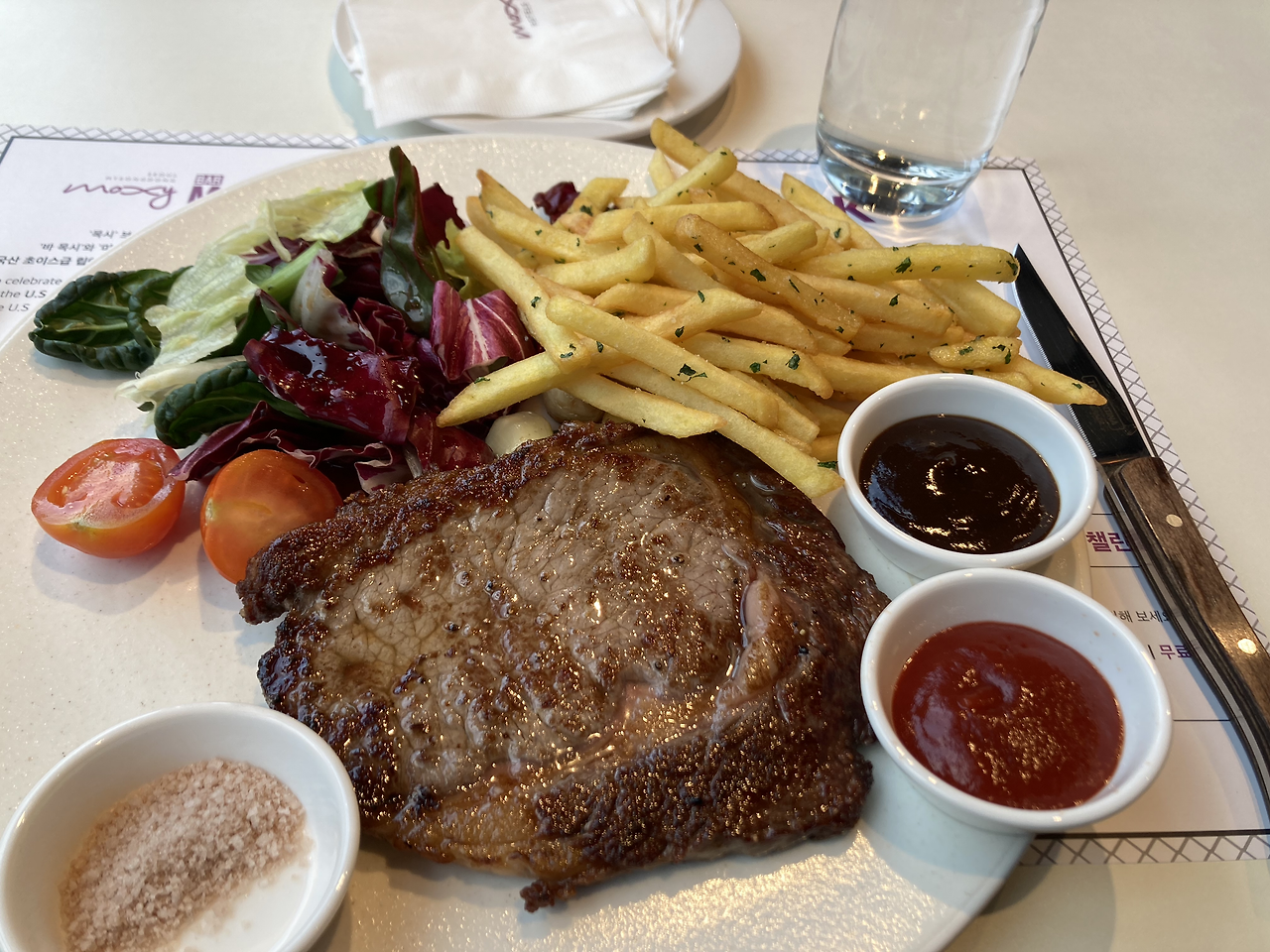 스테이크를 좋아하는 사람은 어떨지 모르겠지만, 얇고 바짝 구운 고기를 선호하는 나는 만족스러웠다. 간은 조금 세다. 평소 채식 위주로 먹다가 고기를 먹으니 포만감의 정도가 확연히 달랐다. 이것이 고기의 힘인가, 배가 꺼지지 않아 저녁은 간단히 과일과 채소로 먹었다.