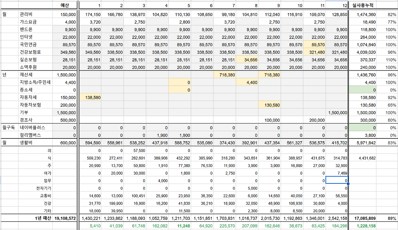 12월 생활비 415,702원. 2024년 한 해 동안 지출한 총금액은 17,085,809원. 연초에 예측한 금액은 2천1백만 원이었는데 종소세를 환급받으면서 1천9백만 원대로 떨어졌고, 월 생활비로 할당한 60만 원을 다 쓰지 않아 최종 1년 지출은 1천7백만 원 선으로 마무리했다. 특별한 사건이 생기지만 않는다면, 당분간은 1년에 2천만 원으로 충분히 살 수 있겠다는 자신이 생겼다.