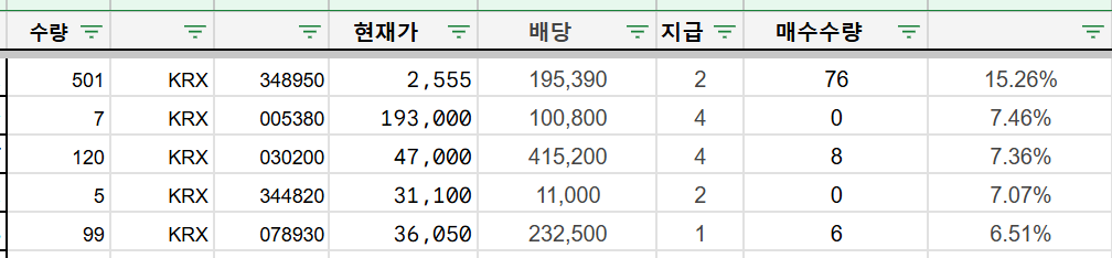올해는 꼭 해보려고 구글시트까지 만들었다. 현재 가격을 기준으로, 작년 배당금으로 구매할 수 있는 수량과 배당수익률을 계산했다. 언제 살까 고민하다가 배당이 들어오면 사고 있다. 배당락으로 가격도 낮아지니 겸사겸사.