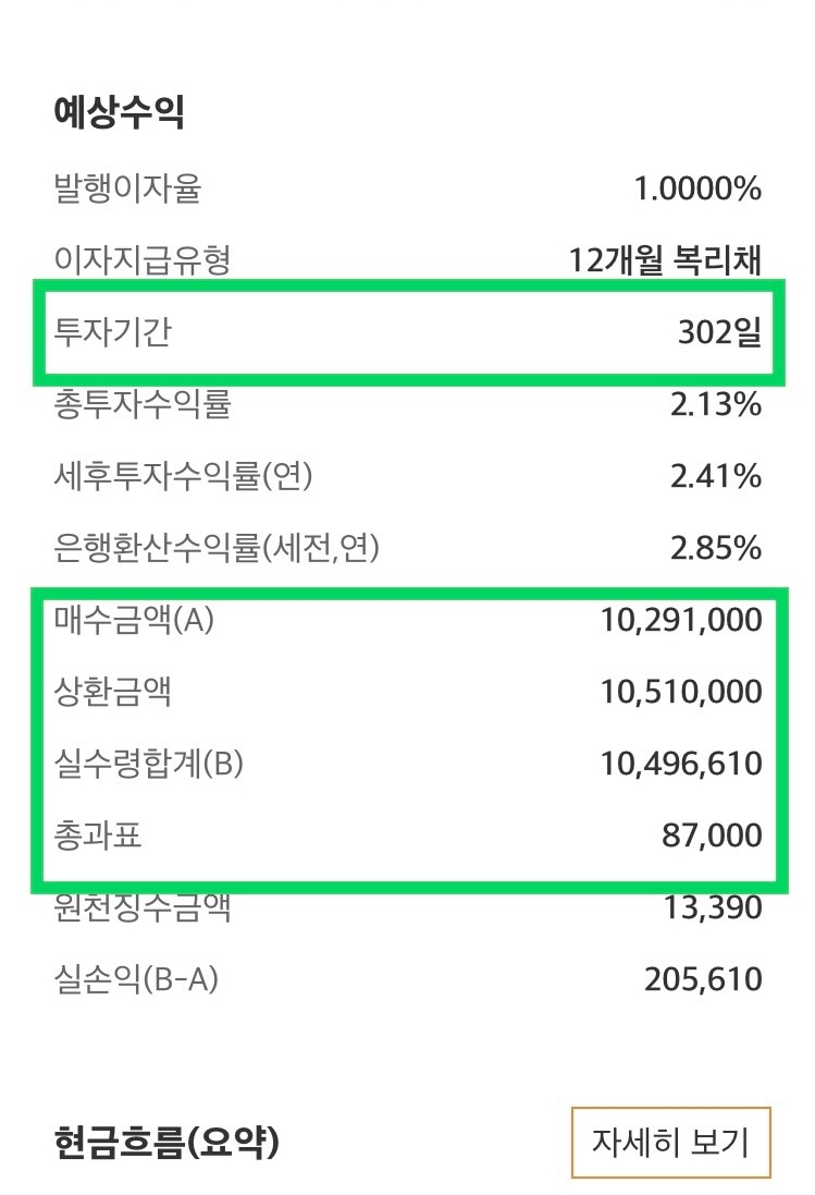 만기이자가 510,000원인데 투자기간이 302일이라 과표는 87,000원이다.