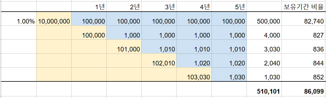 위에 예시한 채권의 이자와 과표 계산은 대충 아래와 같다. 금융 쪽은 자투리 처리가 골치 아픈데, 모의투자내역에서 보이는 값이 나오도록 적당히 맞추었다. 보기 헷갈릴 수 있는데, 노란색은 원금(발행가 기준), 파란색은 좌측 원금에 대한 이자이다. 복리채니까 매해 발생한 이자가 원금에 더해진다. 이자의 이자도 더해지므로 각 시점에 누적된 이자는 윗 행의 합이다. 아마도 총이자는 1천 원 미만 절삭, 세금은 1천 원 미만 올림으로 표기한 것 같다. (금융소득세는 소액부징수가 적용되지 않는다고 한다.)