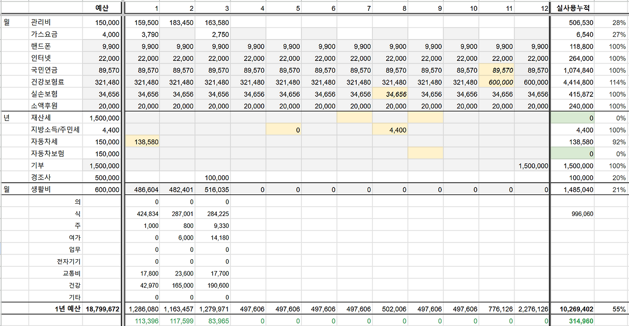 23년은 아무 생각 없이 쓰던 때이고, 24년부터 아끼려고 노력해서 대폭 줄였었다. 방한에 신경 쓴 올해는 당연히 더 줄어들 줄 알았으나, 1월 (12월 사용분)만 줄고 2, 3월은 되려 증가했다. 전기와 난방 사용량은 전년보다 줄었으니 공공요금과 관리비 단가가 오른 탓이겠지. 물가가 오르는 것이야 당연하지만, 2년 만에 고정비가 눈에 띄게 증가하는 것을 보니 살짝 두렵다. 국민연금 보험료율도 오를 텐데.