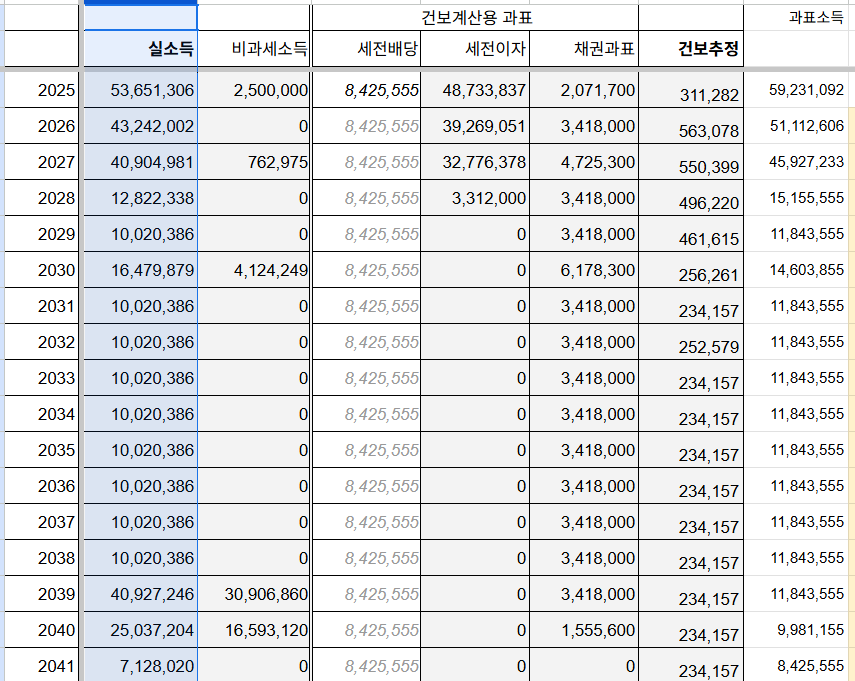 현금흐름을 만들려고 노력 중인데 잘 안된다. 아래 표는 현재 상황. 1~5년 단위로 만기가 되는 예금/채권이 다시 투자될 테니, 27년까지의 소득액만 확정이고 그 이후로는 미완이다. 올해 하반기에 5억 가까이 만기 되는데 어디에 투자할지 이리저리 시뮬레이션을 해보지만 그리 녹녹하지가 않다. 연 세후 4천만 원의 수익을 만들어서 그중 2천만 원을 생활비로 사용하고 나머지를 저축하겠다는 심산이었는데, 금융자산 20억으로 4천만 원 만들기가 (나에게는) 이렇게 어려울 일이었던가.