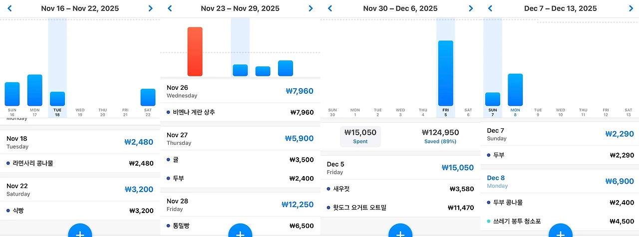 구체적으로 뭘 샀냐면 아래 사진과 같다. (24일 지출은 교통카드 출금이다.) 저것만 사고도 먹고살 수 있었던 이유는 이전에 말했다시피 이미 사서 비축해 놓은 식량이 있었기 때문이다