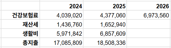 25년 총지출은 1,850만 원이다. 연초에 추정한 예산을 거의 다 사용했다. 24년 지출은 1,700만 원이었고 26년 예측치는 2,200만 원이니 생각보다 지출 증가세가 크다. 올해 26년 예산이 급증한 이유는 건강보험료 탓이긴 한데, 노령화 때문에 앞으로 세금과 보험료가 늘면 늘었지 줄지는 않을 테니 새삼 인플레이션이 두렵다.