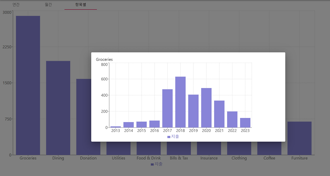 일단 label이 잘 붙어 있는 데이터가 모이면 입맛에 맞게 이러저러 분석해 볼 수 있어서 좋다. 물론 분석한다고 사는 게 크게 달라지는 것은 아닌데 (써야 할 것을 덜 쓸 것도 아니고) 그래도 알고 대비하는 것과 아닌 것은 다르다. 때로는, 과거를 회상하는데 도움도 준다. 저 때 왜 저 항목이 유독 늘었지 생각해 보면 특정한 사건이 일어났던 시기이다. 특정 사건이 일어났을 때 어느 정도의 비용이 필요한지, 규모가 큰 비정기 지출이 어떤 주기로 발생하는지를 알면 미래 대비에 도움이 된다.