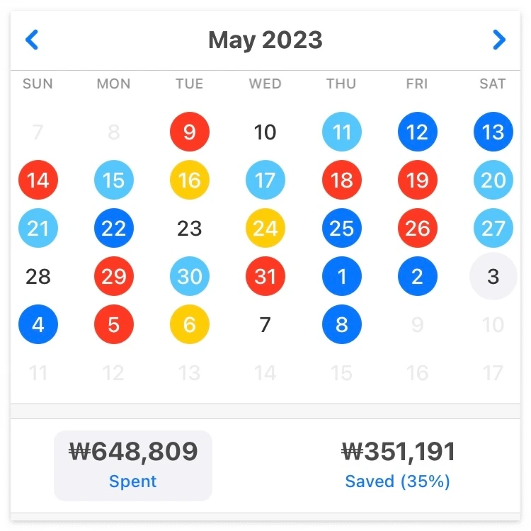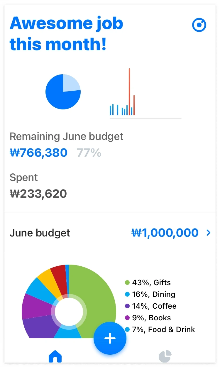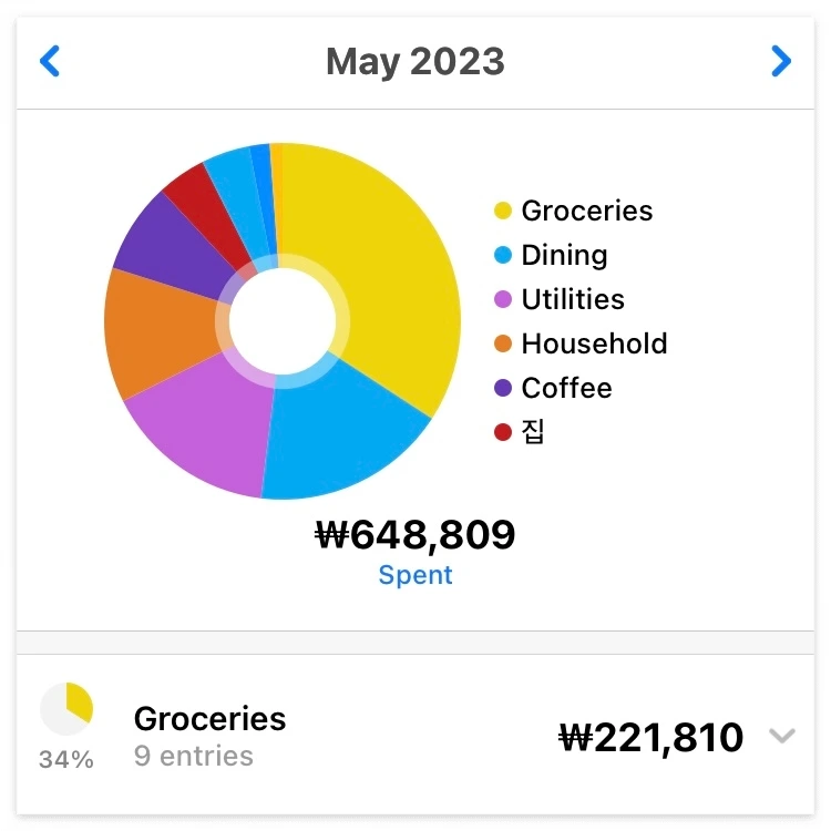 카드사와 연계해 자동으로 지출을 정리해 주는 앱이 많지만, 나는 직접 입력하는 것이 더 좋다. 카드사 연계 앱은 카테고리 분류가 잘 안 된다. 매장 결재 시 업종 분류가 부정확하기도 하고, 간편 결재앱을 사용하거나 온라인 구매를 하는 경우는 더더욱 어디에 돈을 썼는지 알 수가 없다. 게다가 신용카드가 아닌 복지포인트나 상품권 사용 금액은 누락되는데, 기록의 목적이 내 생존 비용이 얼마인지를 알기 위함이므로, 내가 카드 값을 내지 않는다 하더라도 지출에 포함시켜야 정확한 필요 생활비를 알 수 있다. 그리고 아무래도 결재할 때마다 직접 입력하는 것이 내가 어디에 돈을 쓰는지, 이번 달 누적 지출 금액이 얼마인지 한 번 더 인지할 수 있어서 좋다.