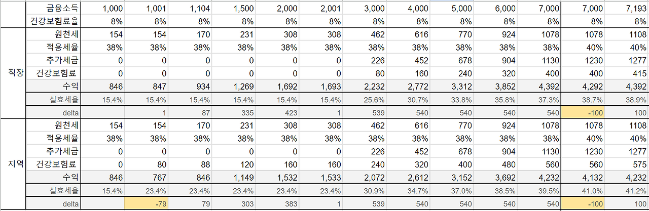 소득이 많은 사람이 더 많은 금액의 세금을 내는 것은 당연하다. 소득이 늘어 손해를 보았다고 말하려면, 소득이 늘었는데도 순수익이 줄어드는 경우이어야 한다. 결론만 보면, 그런 일이 발생하는 것은 딱 두 경우이다. 1) 지역가입자일 때, 금융소득 1,000만 원 초과 시 초과분이 아니라 전액에 건강보험료를 부과하므로, 이 시점에 역전 현상이 일어난다. 세율에 따라 다르겠지만, 대략 1,000-1,100만 원 구간이다. 그래서, 1,100 만원 이상이면 굳이 금융소득을 줄여보려고 신경 쓸 필요가 없다고 한다.