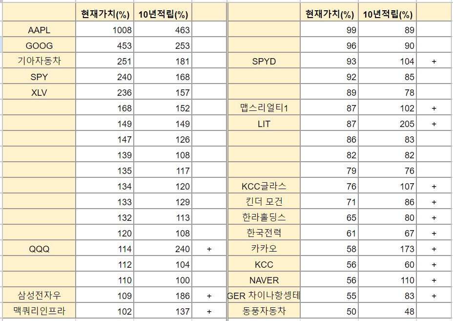 "현재가치"는 실제 수익률(정확히는 투자금 대비 현재 가치)이고, "10년 적립"은 10년 간 매월 1일 종가로 일정 금액을 구입하였을 경우의 수익률이다. 종목명은 현재 두 배 이상 상승한 것과 10년 적립식 투자가 더 나은 결과를 보이는 것만 표기했다. 적립식 투자가 더 좋은 성과를 내는 항목은 "+" 표시되어 있다.