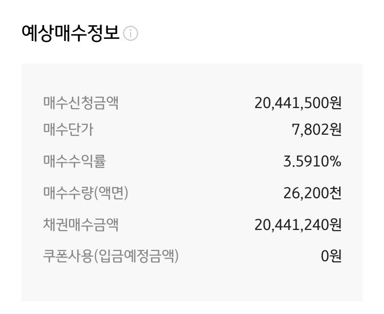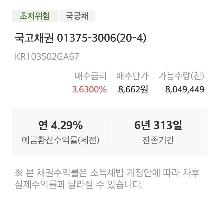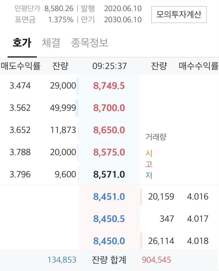 아래는 동일 채권의 장외거래 매수가격과 장내거래 매매호가이다. 수수료 최대 0.3%으로 적용해도 장내거래 가격이 저렴하다. 8,662원 > 8,571 * 1.003 = 8,596.713원