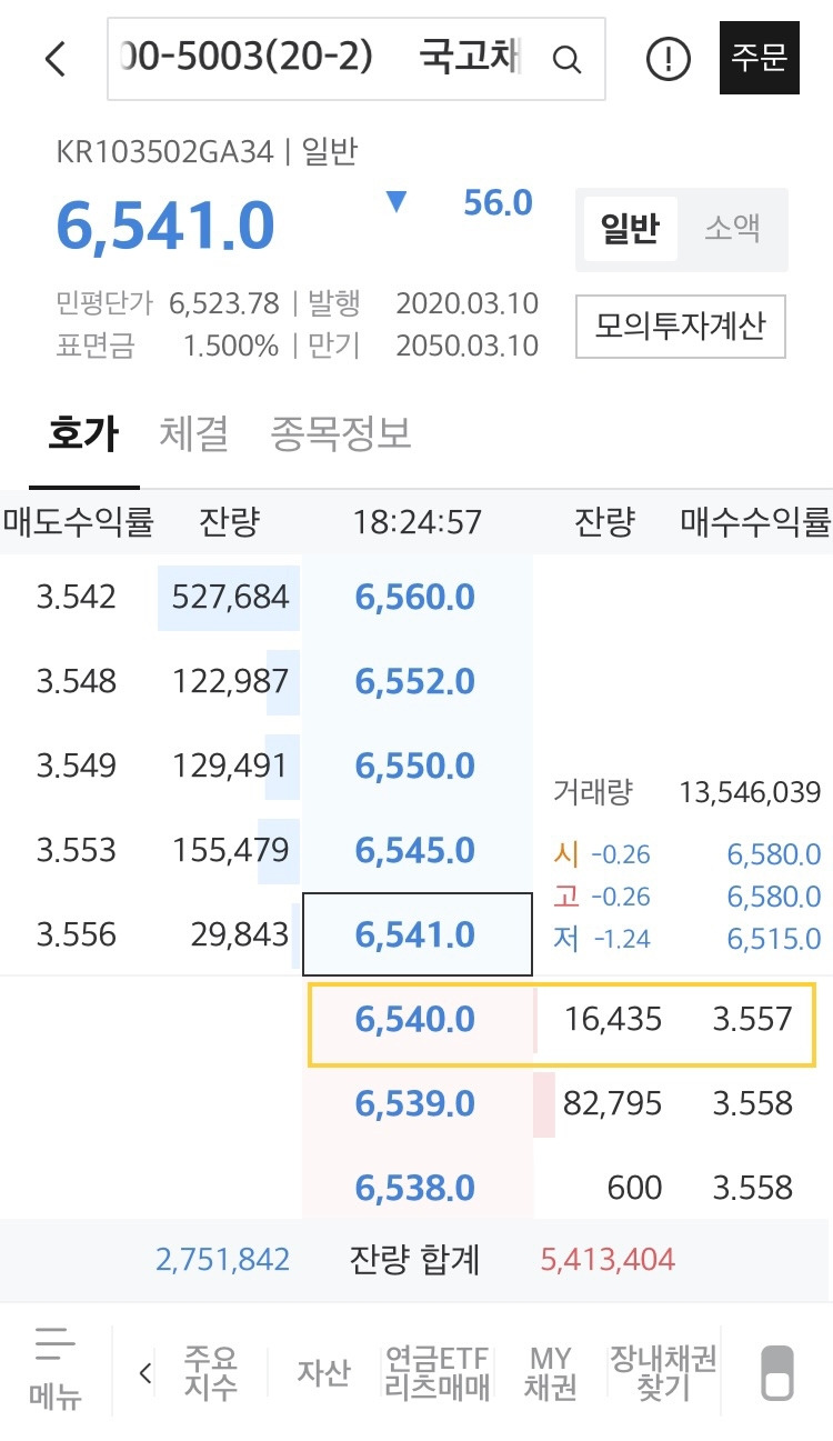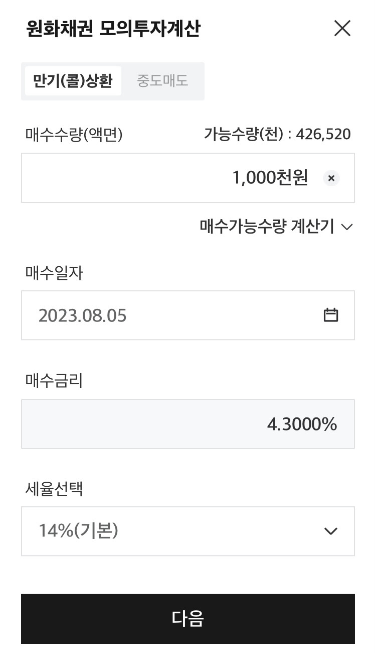 증권사 설명에 따르면, 매수금리는 세전 만기수익률이라 하는데, 그렇다면 예금환산수익률과 같아야 하는 것이 아닌가 싶지만 예금환산수익률이 언제나 더 높게 나온다. 위 채권의 경우, 6540원, 3.557%의 매수금리로 매수했을 때 예금환산수익률은 4.68%, 세후수익률은 3.96%가 나온다.