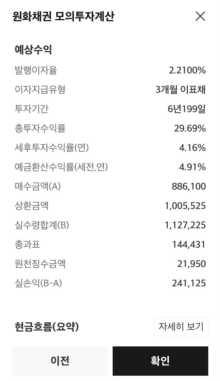 - 실손익은 (만기까지의 실제 수령금액 - 매수금액) = 241,215원이다.