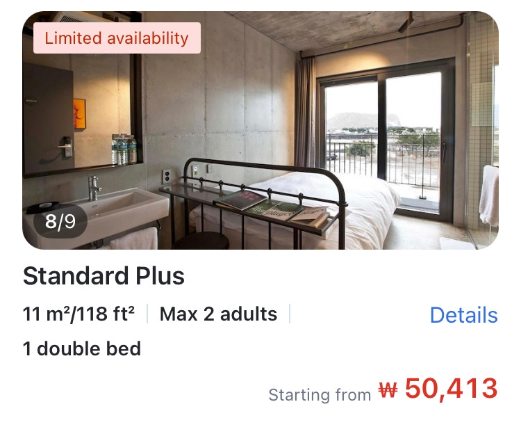 성산일출봉이 보이는 방에 묵고 싶었는데, 몇 년 전에 내가 알던 가격보다 올라서 가장 저렴한 스탠다드룸을 예약하려 했다. 공식 홈페이지에서 17만 원인데 Booking.com에서는 15만 원. 예약 버튼을 누르려다가 잠시 인터넷을 검색해 보니 Agoda에서 스탠다드 플러스룸이 16만 원이다! 냅다 성산일출봉이 보이는 플러스룸으로 예약했다. 잠시 뿌듯해하다가 Agoda에서 스탠다드룸을 예약하면 14만 원인데 괜한 낭비인가 이내 후회가 된다. 1~2만 원 차이에 이렇게 마음이 흔들리다니. 2백만 원 정도는 미련 없이 쓰던 과거의 나, 이젠 안녕.
