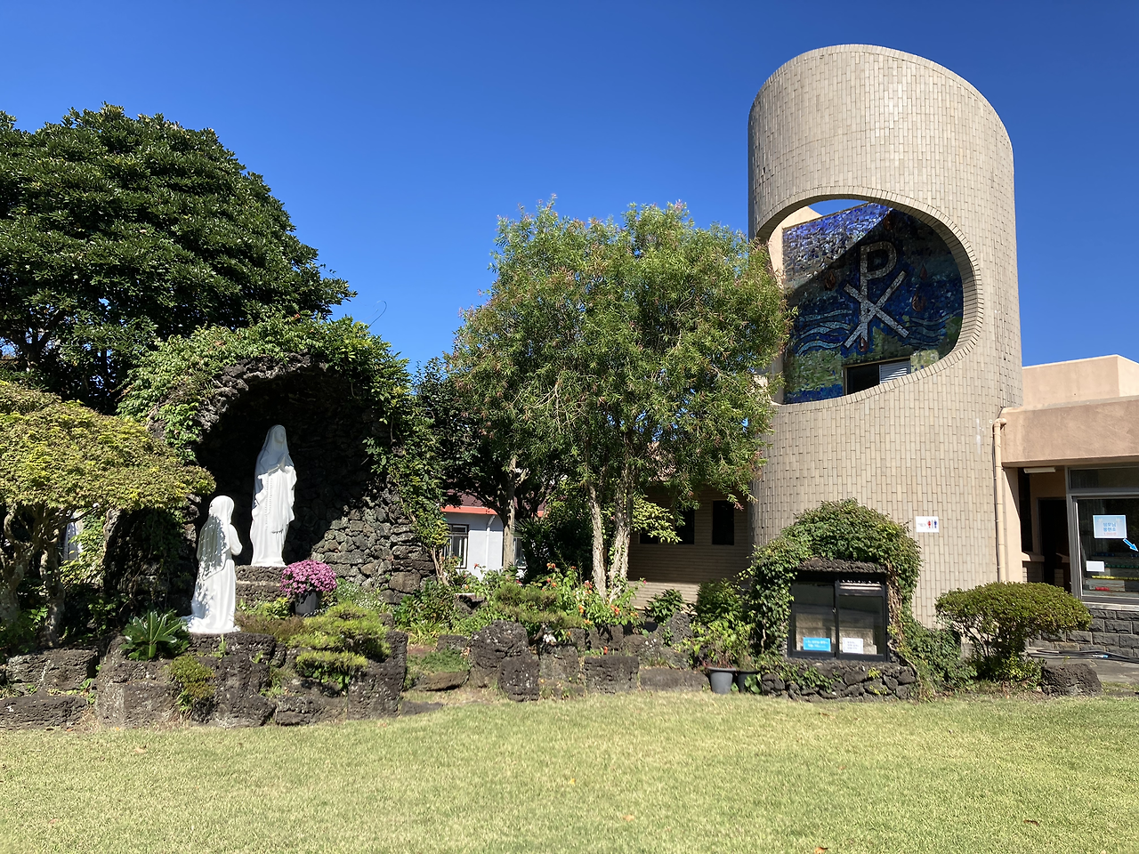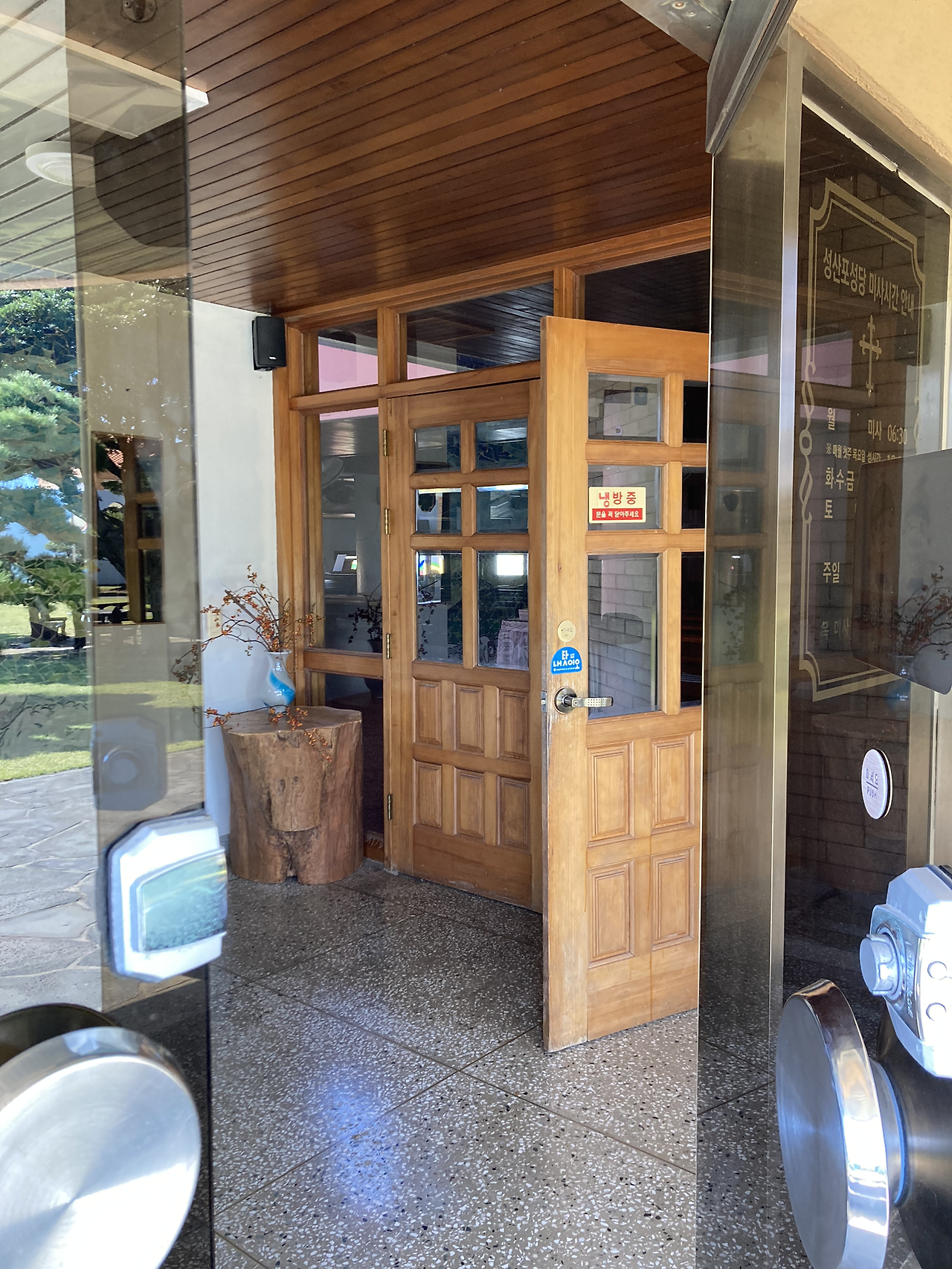 원래는 성산일출도서관에 가려했는데 시설보수로 공사 중이라 근처 성당에 잠시 들러보았다. 예배당은 천장이 나지막한 것이 특색 있었다. 나무로 만들어진 문과 가구가 오래된 건물 특유의 따듯함과 정성을 느끼게 한다.
