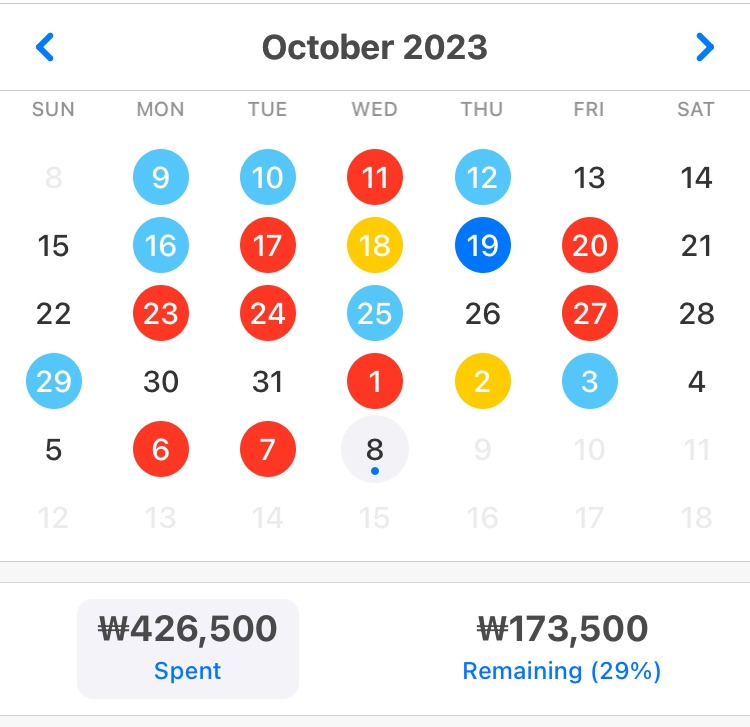 10월부터 슬슬 백수의 마음으로 살아보려고 노력했다. 그리고 변경된 기준으로 지출 기록을 했다. 내 가계부는 9일이 한 달의 시작이므로 오늘 첫 한 달이 지났다.