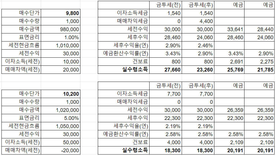채권 수익이 금투세 전과 후에 어떻게 바뀌는지 계산했고, 예금과 비교하기 위해서 채권의 예금환산수익률과 동일한 금리일 때 예금의 실수령 소득을 역으로 계산했다.