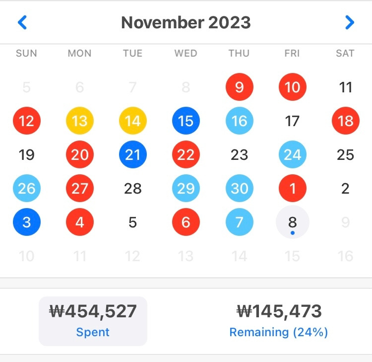 이번에도 지난달과 대동소이하게 지출했다. 생활비 60만 원에서 14만 원을 남겼다. 그러나 10월은 딱히 의식하지 않고 어려움 없이 보낸 반면, 이번 달은 의도적으로 아끼며 살았다. 돈을 쓰고 싶은데 꾹 참고 넘겼다. 먹고 싶은 것을 참았고 사고 싶은 옷을 사지 않았다. 쓸모없는 소비욕구를 누른 건지, 나를 쥐어짠 것인지 아직 잘 모르겠다. 어찌 되었건 스트레스를 받지는 않을 정도이어야 지속가능할 텐데.