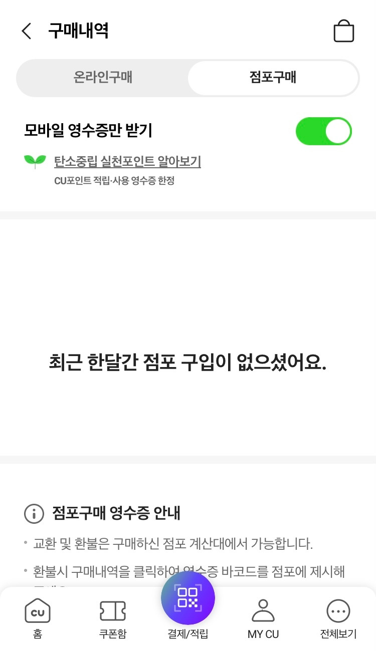 네이버 앱에 CU와 GS 멤버십을 추가하면 이후 네이버페이 현장결재 시 따로 멤버십 카드를 제시 안 해도 자동으로 적립이 된다. 하지만, 연동된 멤버십의 포인트만 적립이 되고, 해당 업체에서 영수증 발행을 하지 않기 때문에 (네이버가 결제 금액만 나와있는 간이(?) 영수증을 발행한다.) 네이버페이 현장결제시에는 탄소중립포인트는 아마 적립되지 않을 것 같다.