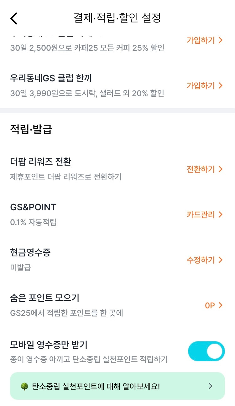 포켓CU, 우리동네GS 앱을 다운 받는다. (나는 둘 다 이미 가입해 있었다. 편의점 한정상품 구매할 때 매장 재고 확인하려 설치했었다.) 각기 앱에서 모바일 영수증만 받기 항목을 ON으로 설정한다.