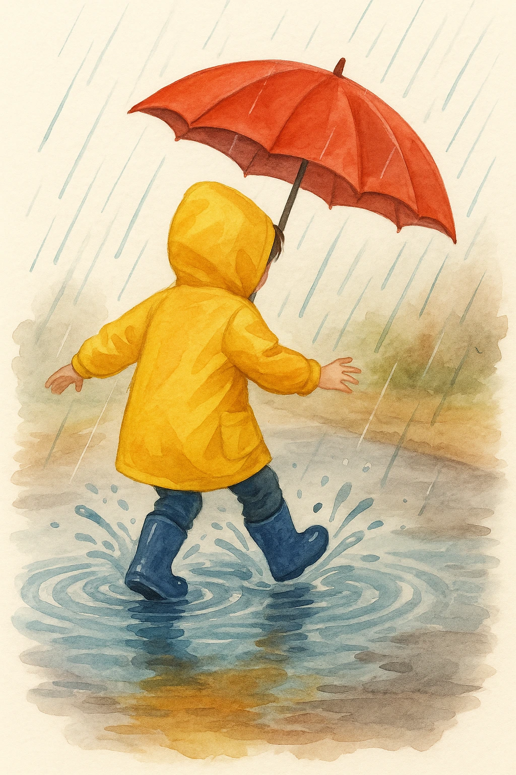 우비를 펄럭이며 물웅덩이를 첨벙거리며 뛰어놀고 서로를 바라보며 깔깔 웃고 있었다.