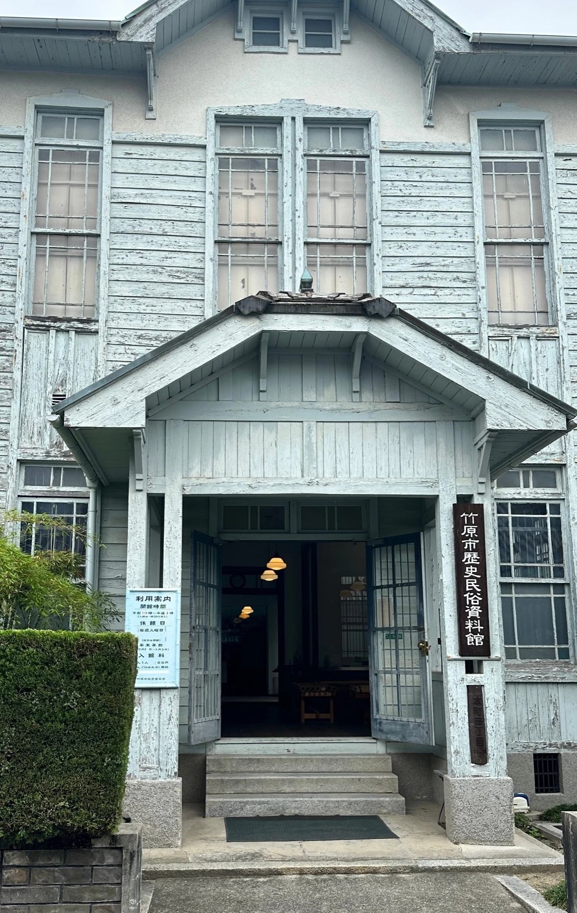 한참을 걷다 보면 굉장히 눈에 띄는 파란색의 오래된 건물이 나오는데 다케하라시 역사민속자료관이다. 에도시대 <다케하라 서원>터에 세워진 서양식 건물로 염전 관련 자료가 전시되어 있다고 한다. 그 외에 몇 개의 주택이 중요문화재로 지정되어 있는데, 사실 설명을 봐도 의미를 잘 모르겠다.