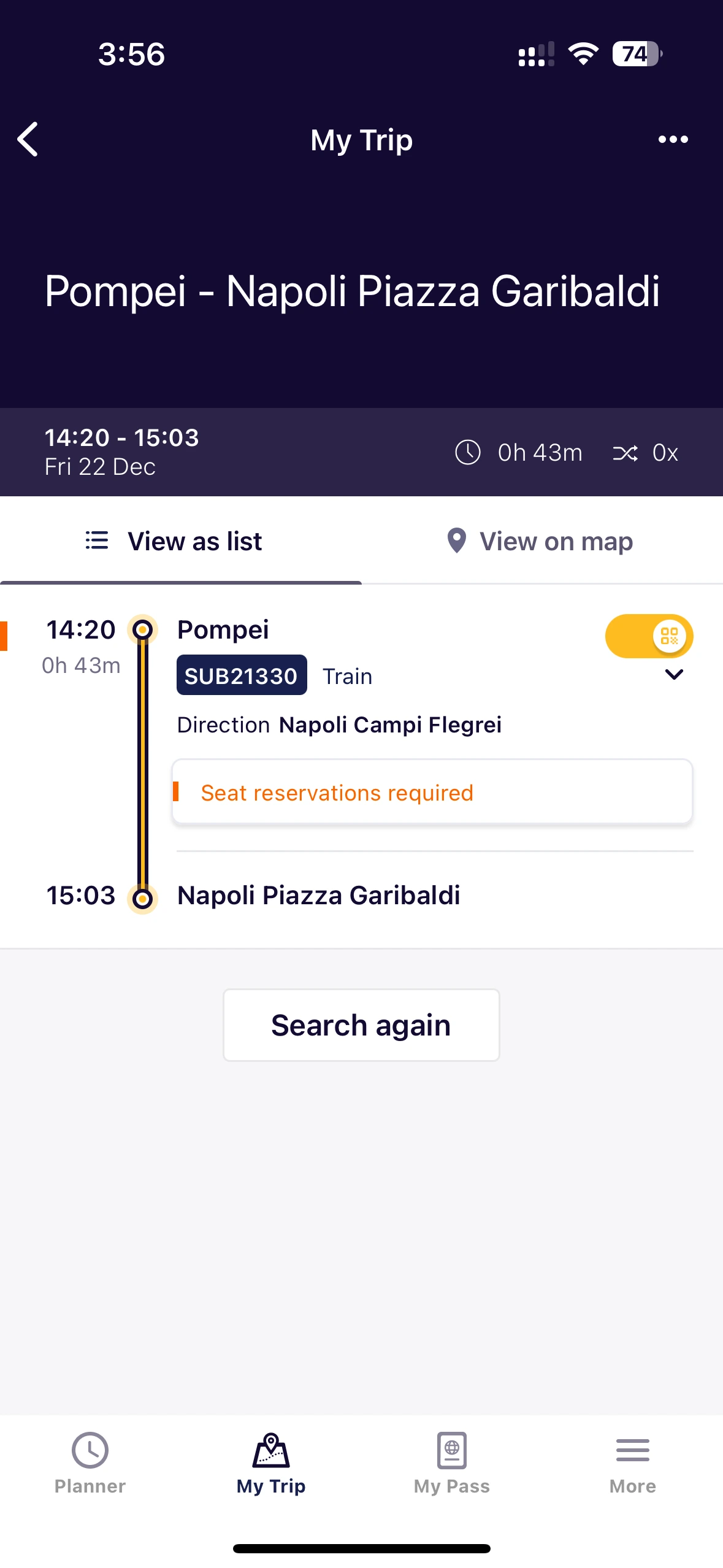 우리는 현장에 가기 전에 의문이 있었는데 유레일 패스를 쓰면 사용해야 하는 레일플래너 앱에서는 폼페이 역에서 나폴리 피아짜 가리발디 Piazza Garibaldi 역(나폴리 첸트랄레 역과 사실상 같은 곳)까지 가는 기차를 검색하면 아래처럼 좌석 예약 필수라고 나오기 때문이었다.